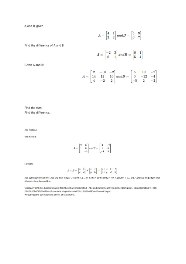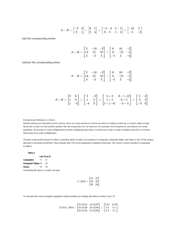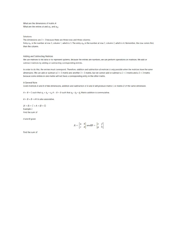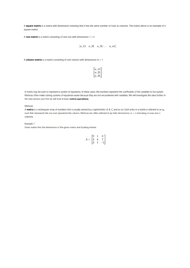 Overview of matrices: rectangular arrays of numbers, defining rows/columns and entries. Covers dimensions (m×n), locating entries, types (square, row, column matrices), and using matrices for computations (e.g., soccer equipment costs).